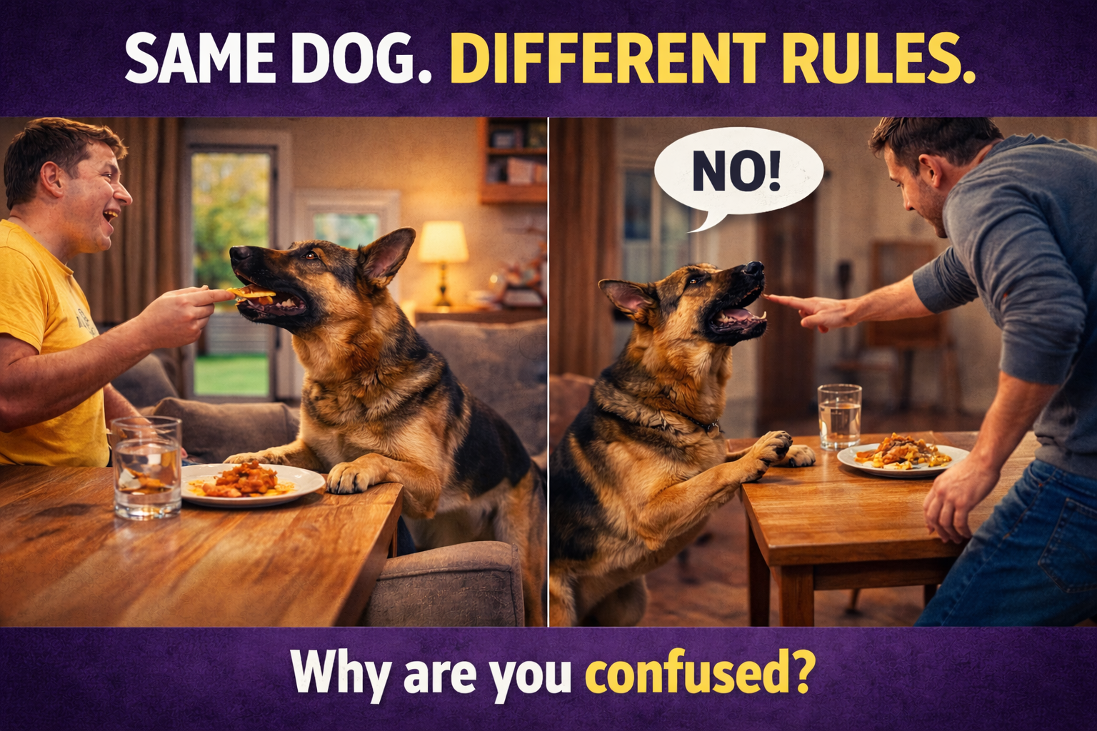 If you do not want begging, then food does not come from the table. Ever. Meals happen separately, and calm behavior is what gets rewarded—not hovering, staring, or pestering.