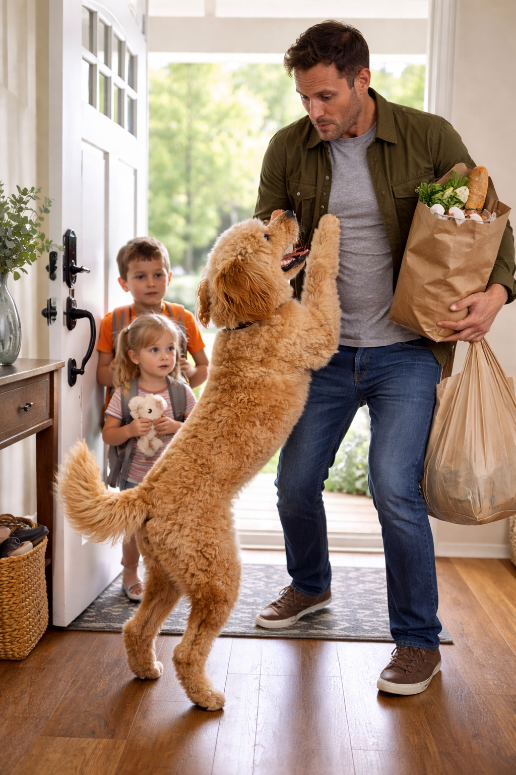 The door opens, the dog’s nervous system spikes, and everything speeds up. Heart rate rises. Anticipation builds. Movement gets bigger. Jumping is simply an efficient way to close distance and immediately change what’s happening.