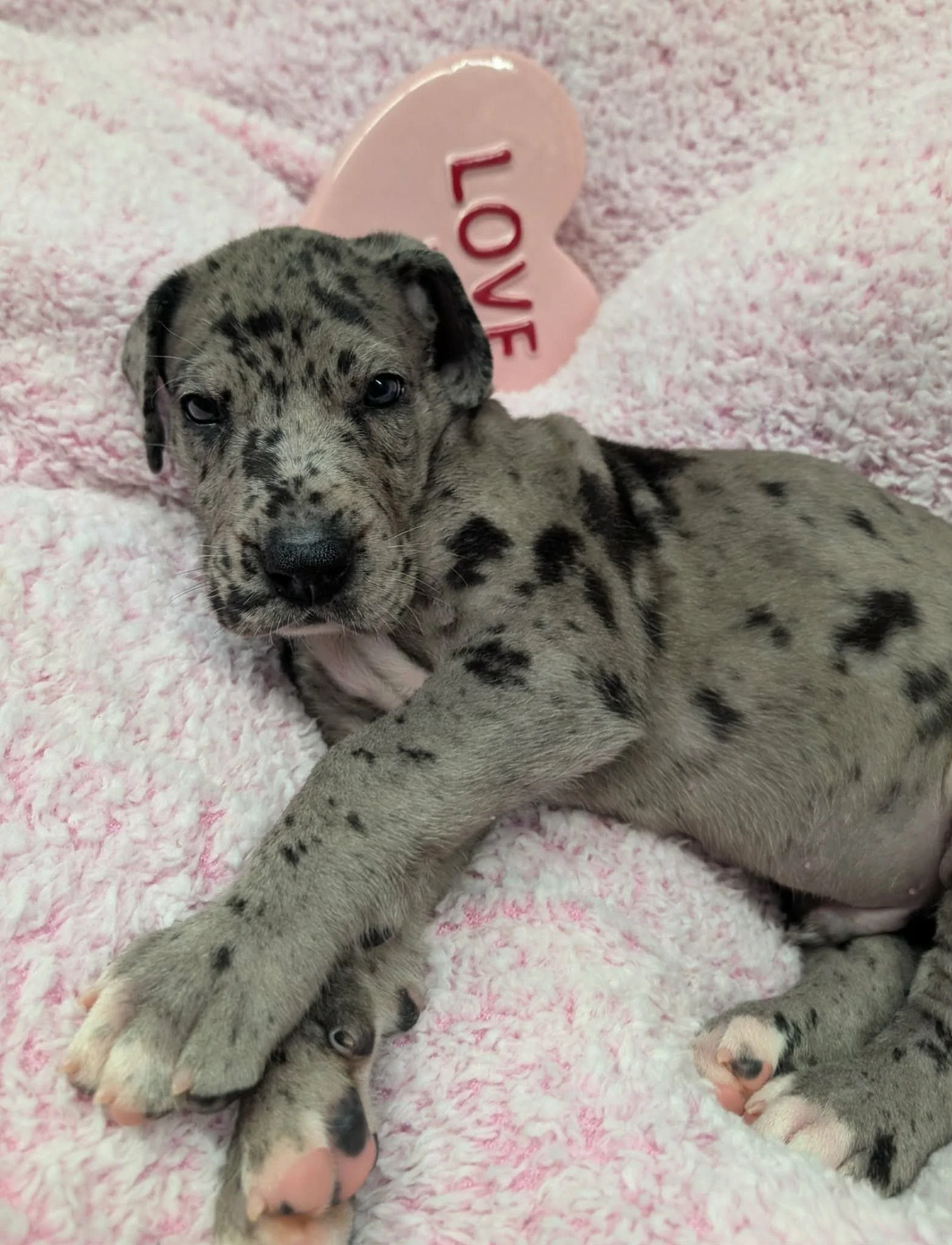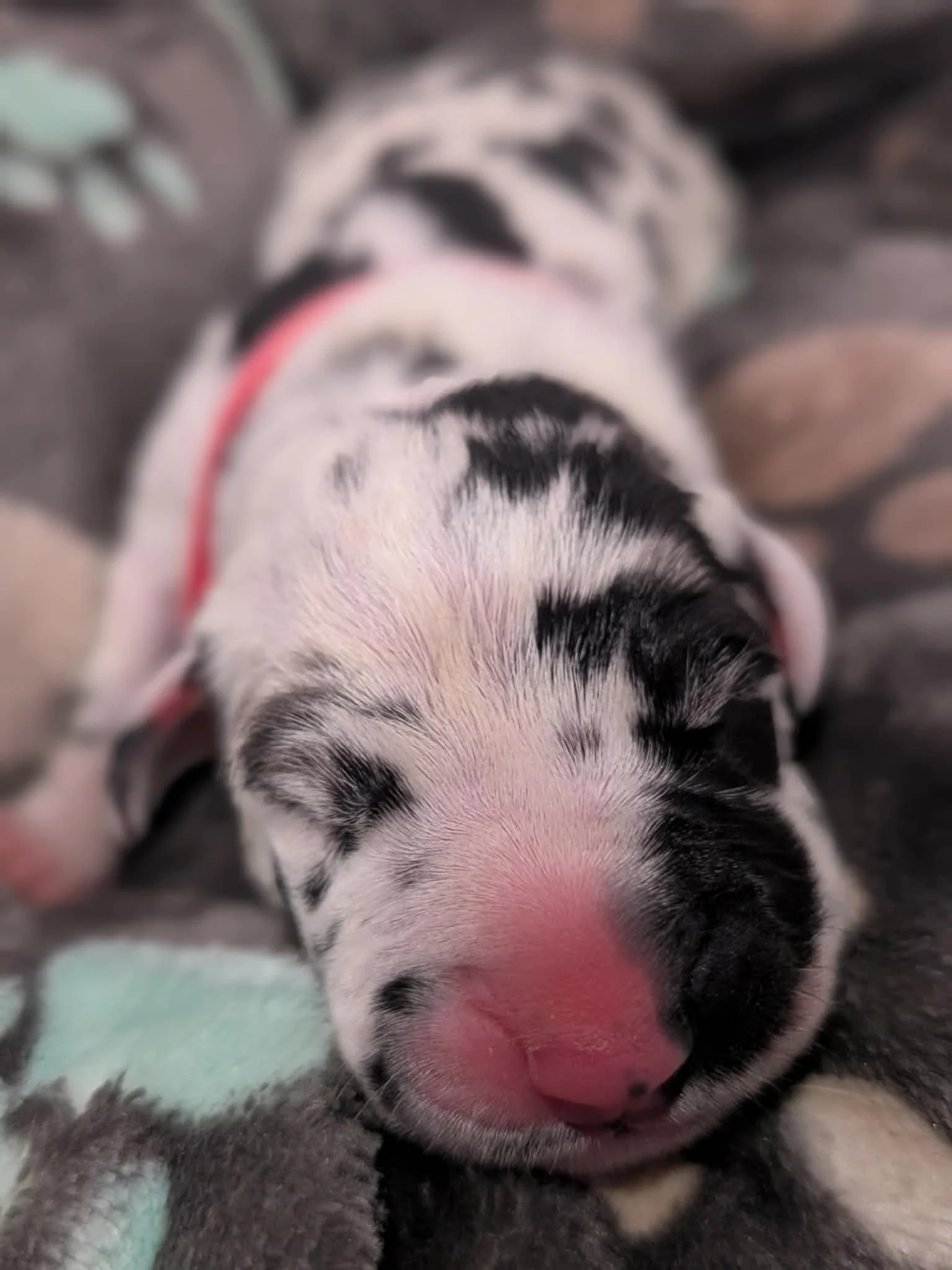 Jolene gave birth to 10 beautiful, healthy puppies- 8 females and 2 males. Black, Harlequin and Merle Puppies Available